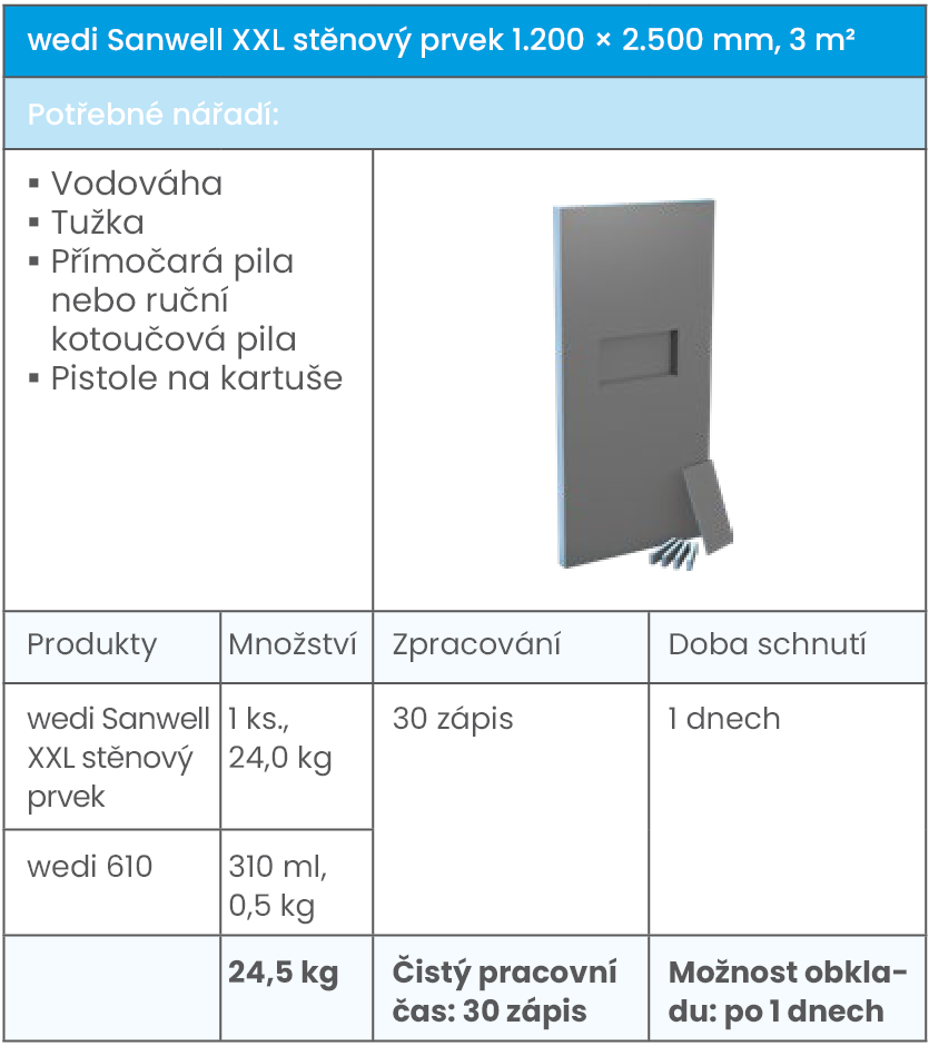 Sprchový modul wedi Sanwell zjednodušuje a urychluje montáž a zároveň poskytuje dlouhodobě spolehlivé řešení. Je vhodný jak pro instalaci na zadní stěnu, tak i jako volně stojící sprchová příčka a je k dispozici v různých tloušťkách a šířkách. Továrně integrované technické komponenty lze – podle konkrétní situace – umístit individuálně do požadované výšky.