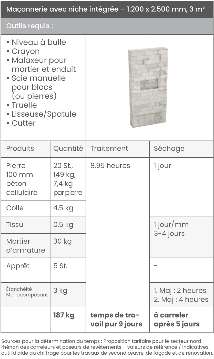 „Nous avons toujours fait du maçonné“ ou encore „trop cher“ – de nombreux professionnels restent attachés aux méthodes traditionnelles et préfèrent construire des cloisons en maçonnerie, en béton cellulaire ou avec des profilés de cloison sèche, plutôt que d’opter pour les nouvelles solutions murales wedi, pourtant bien plus rapides à mettre en œuvre. La comparaison directe montre cependant que les avantages supposés des cloisons traditionnelles sont bien souvent infondés. Les paramètres suivants sont comparés : Les paramètres comparés incluent la quantité et la nature des matériaux, ainsi que les temps de mise en œuvre et de séchage. Gagnez du temps sur le chantier et travaillez de manière efficace, simple et sécurisée – grâce aux solutions murales de haute qualité signées wedi.